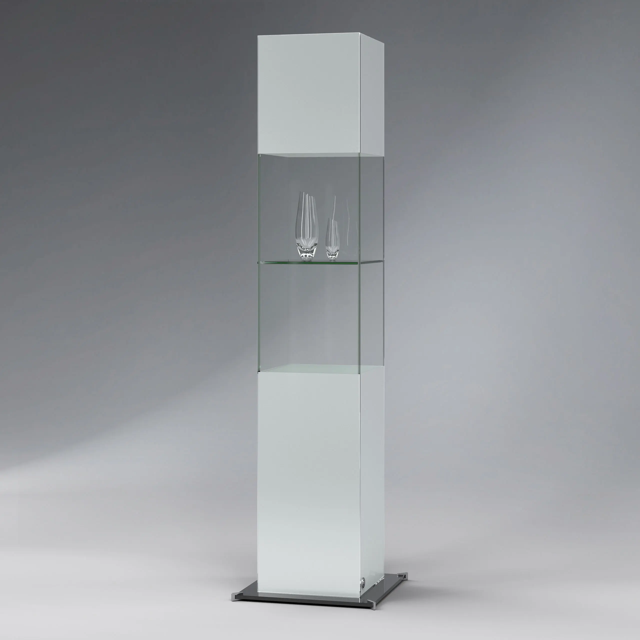 Säulenvitrine Ganzglas mit Deckel - Design-Vitrine für Museen, Ausstellungen oder das exklusive Büro Rahmenlose Ganzglas-Vitrine mit ESG-SicherheitsglasInkl. 3 Glasfachböden, an senkrechten Edelstahl-Stangen stufenlos höhenverstellbarOptionale Beleuchtung mit LED-Strahlern in der Vitrine Größen B/H/T500 × 1900 × 500 mm600 × 1900 × 600 mmSonderanfertigung auf Anfrage Oberfläche - Standard: Sockel/Deckel wahlweise in schwarz, weiß oder hellgrauOptional (gegen Aufpreis): Lackierung in RAL-Farbton nach WahlBeleuchtung - Ohne Beleuchtung – Beleuchtung mit 1 LED-Strahlern, in Deckenbereich integriert - Optional Set mit 4 oder 8 LED-Strahlern in Niedervolt-Technik, anschlussfertig inkl. Trafo an senkrechter Edelstahlstange3 Glasböden inklusive, stufenlos höhenverstellbar.Max. Belastbarkeit ca. 15 kg je Fachboden bei gleichmäßiger LastverteilungVerglasung - ESG-Sicherheitsglas bei allen außen liegenden GlasflächenÖffnung - Ganzglas-Drehtür mit Drehbändern, nach rechts öffnendSchließung - Sicherheitsschloss im unteren Bereich der Tür